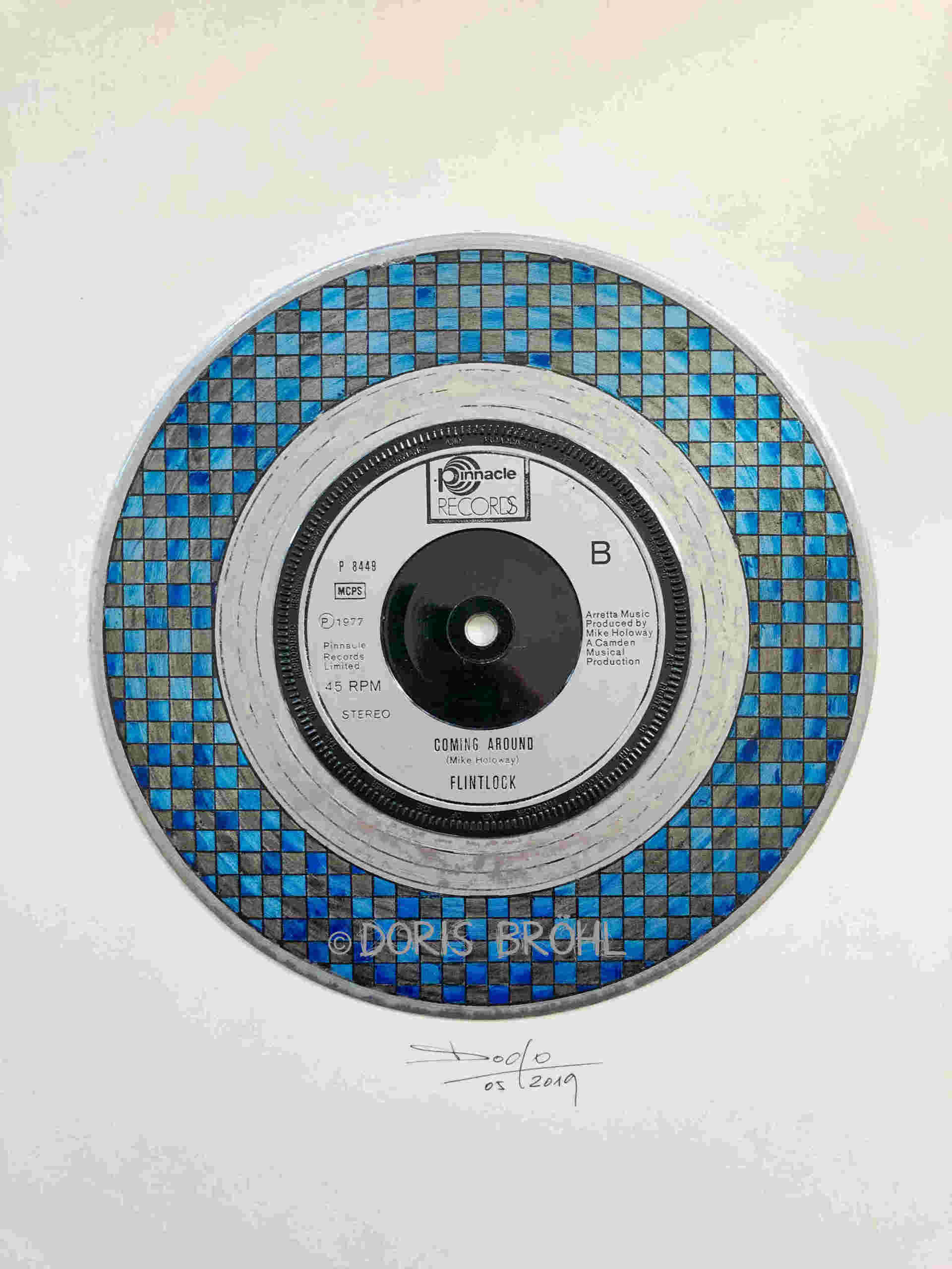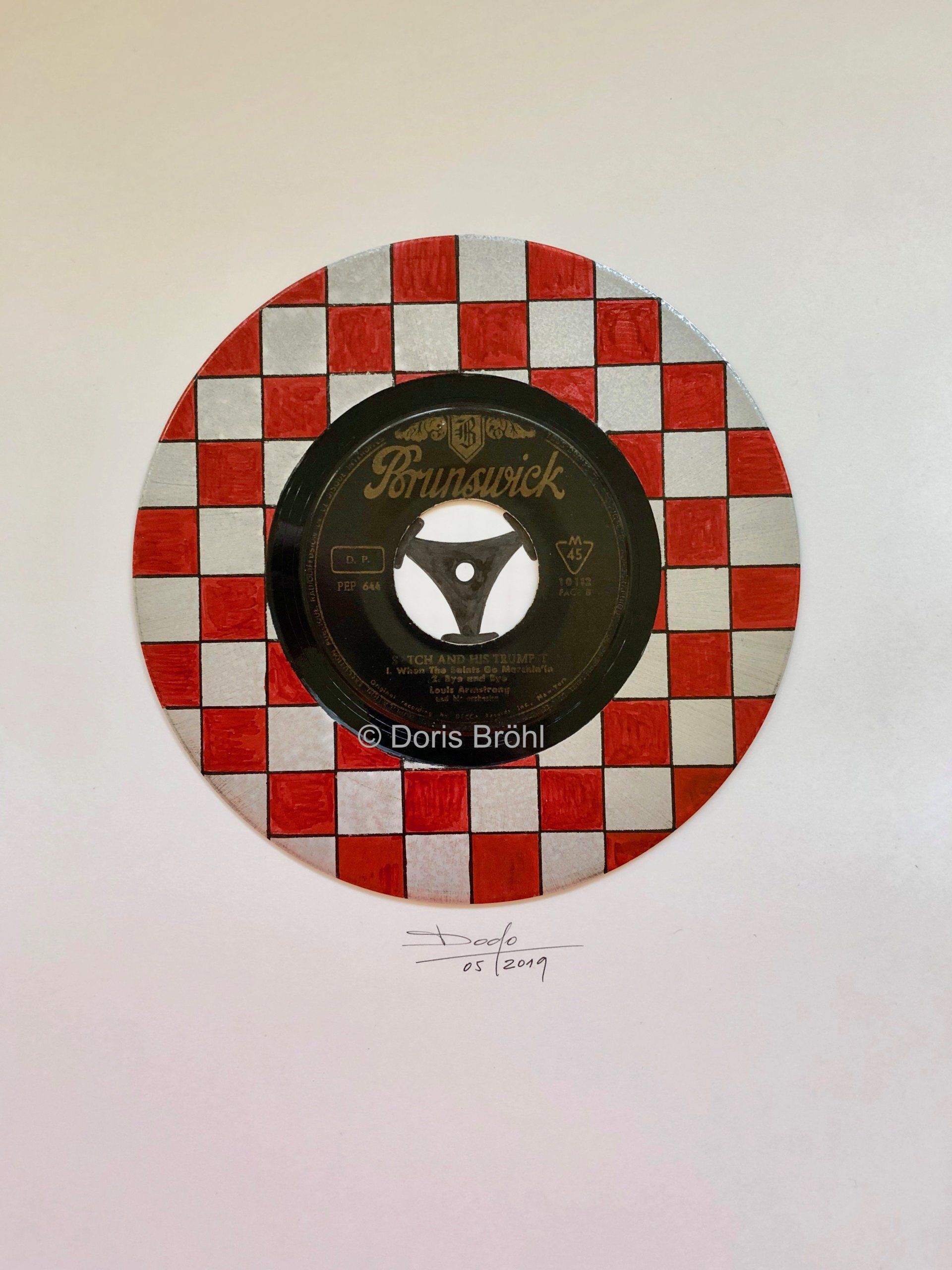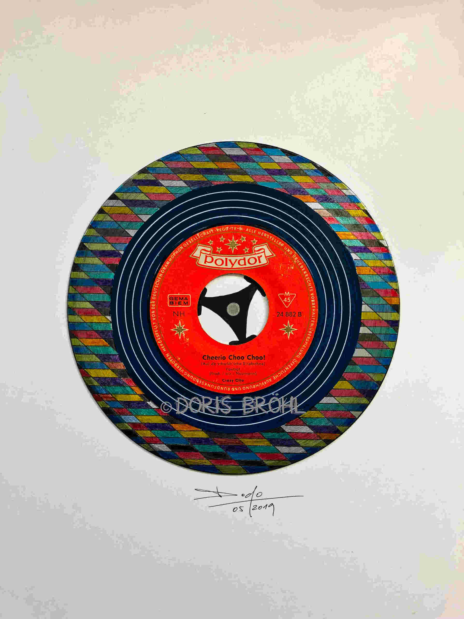 Hier habe ich alte Single-Schallplatten bemalt und sie auf einen weißen Zeichenkarton 30x40 cm geklebt
