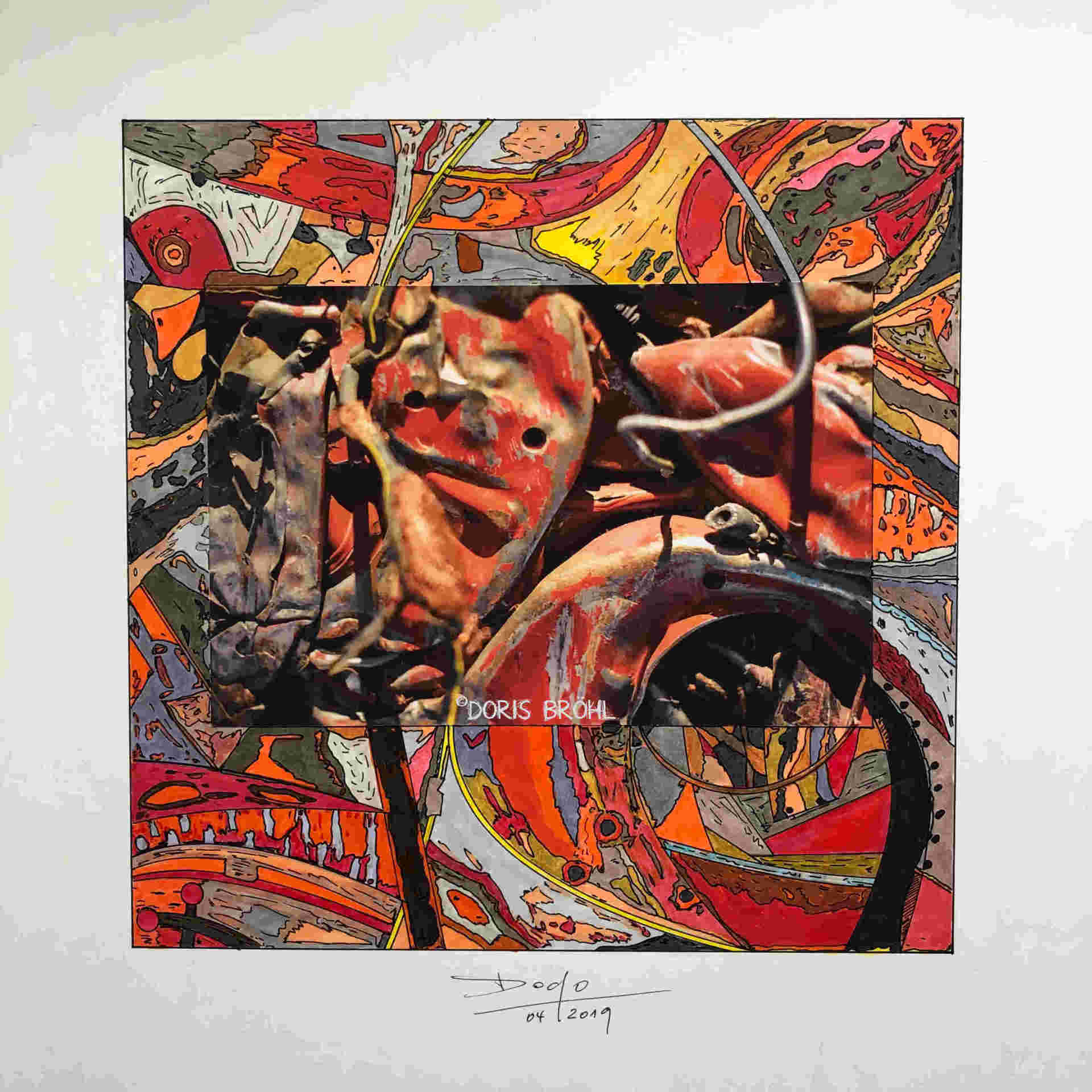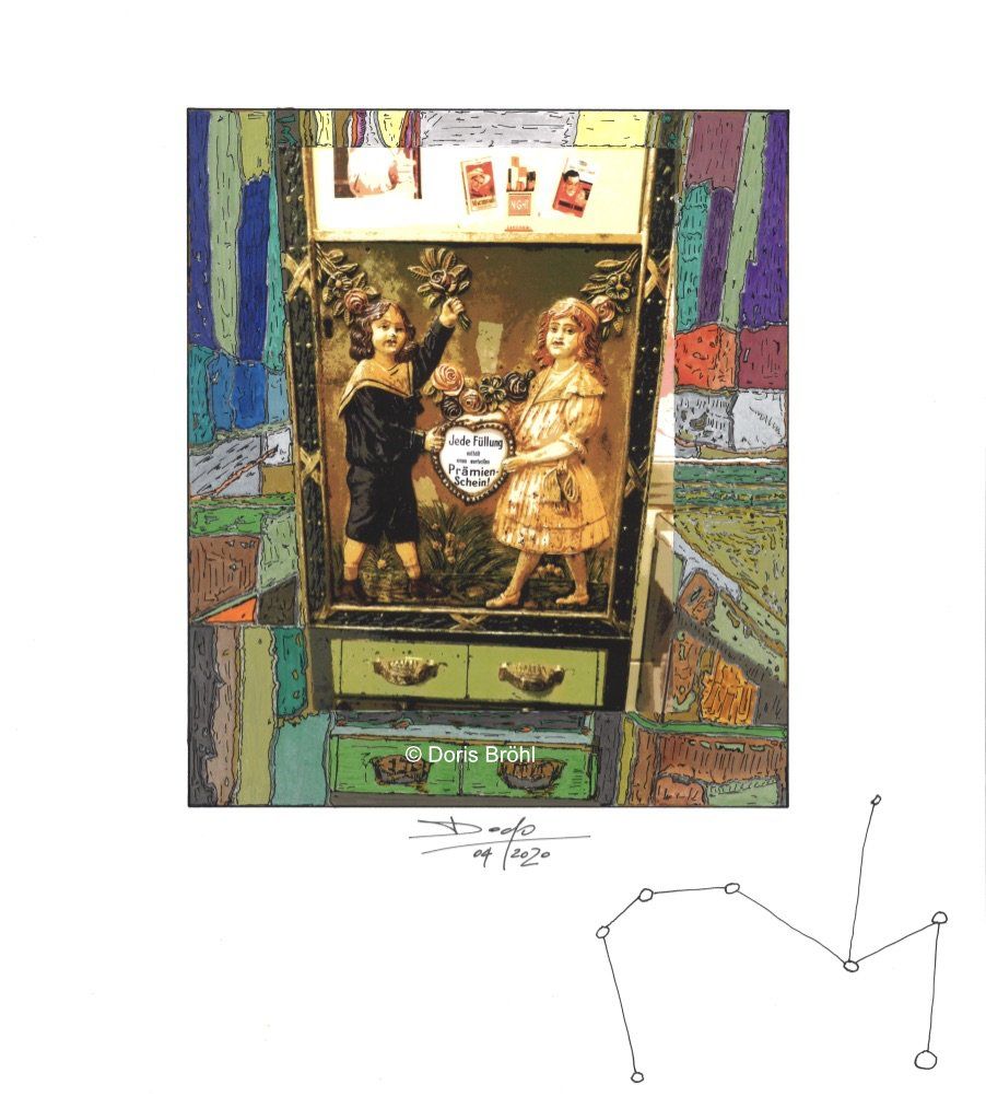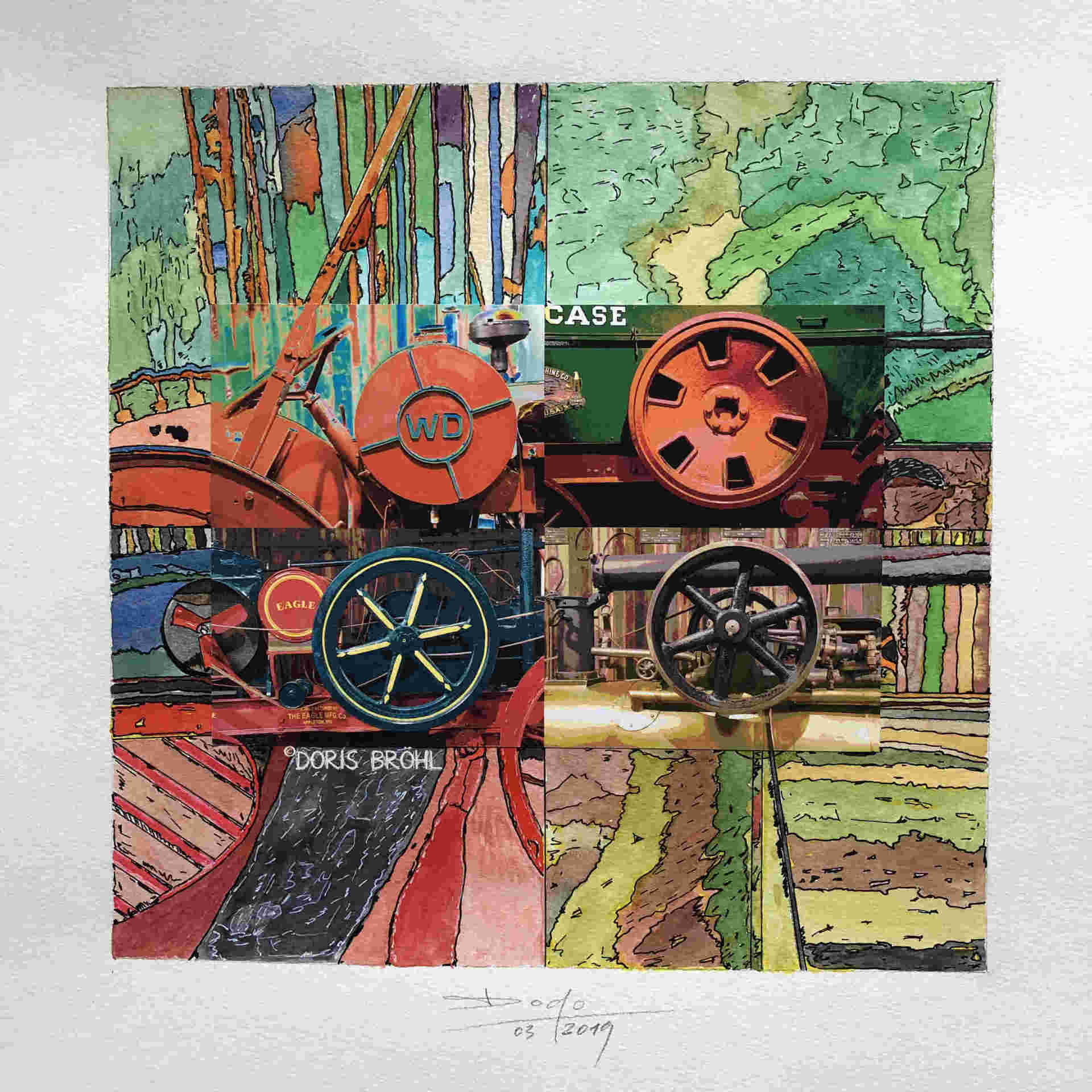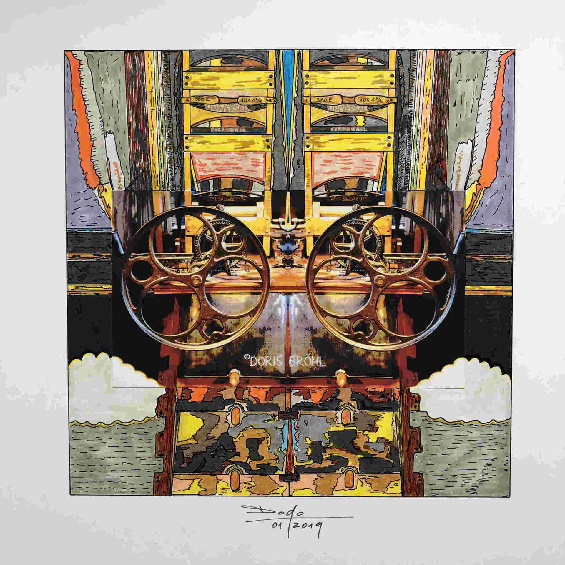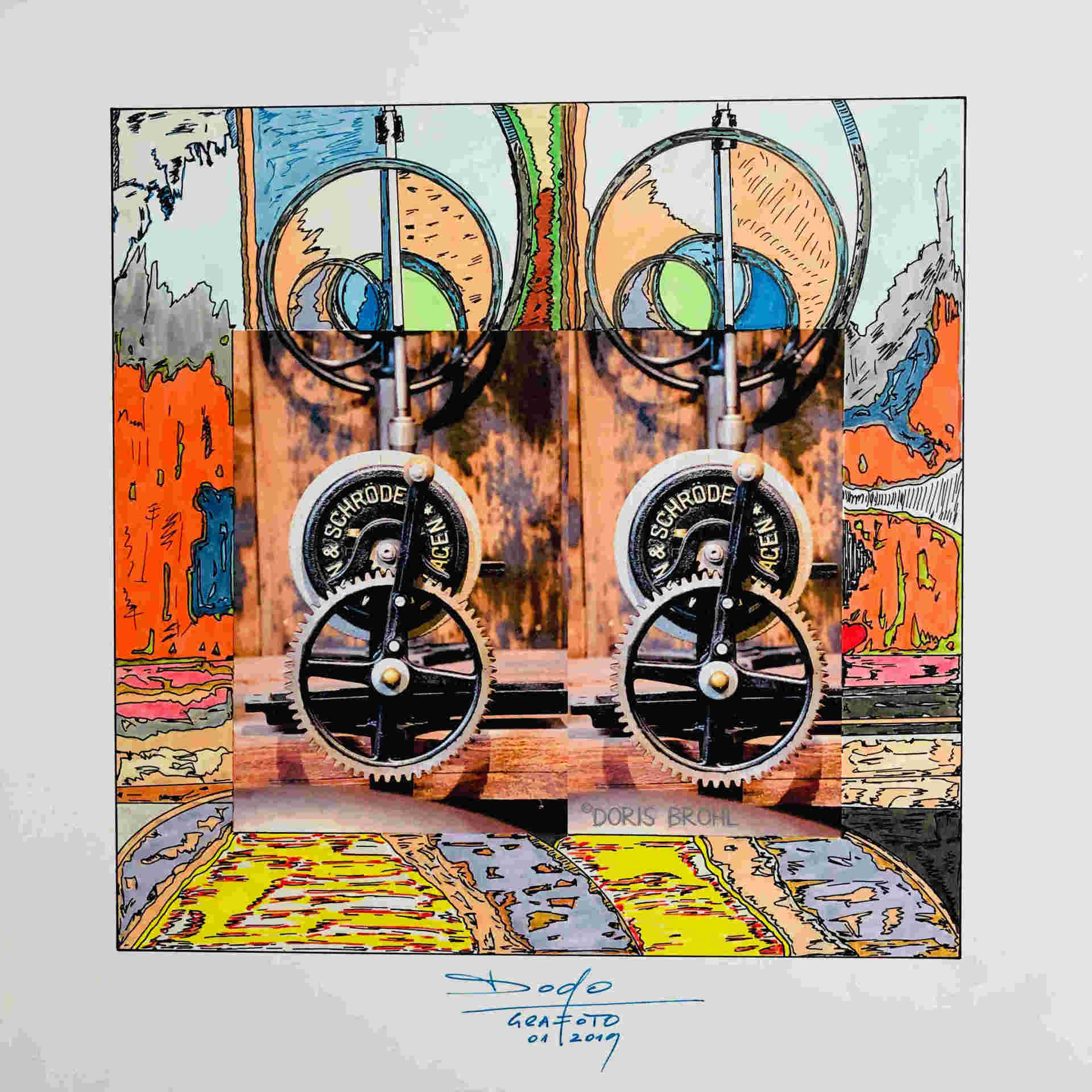 Eine Kamera habe ich immer dabei. Daraus entstehen viele Momentaufnahmen. Bei den nachfolgenden Bildern sieht man die Kombination aus größtenteils eigenen Fotografien und den von mir selber gezeichneten und colorierten "Ergänzungen" zur Fotoaufnahme aber auch viele gezeichnete und montierte Bilder. In manchen Bildern verwende ich Originalteile direkt im Bild. Das können z.B. Unterlegscheiben, Kordel und Fäden, Glasröhrchen, Rührstäbchen, Teile aus alten Uhren, Alu-Profile, Knöpfe etc. etc. sein oder auch nur Objekte.