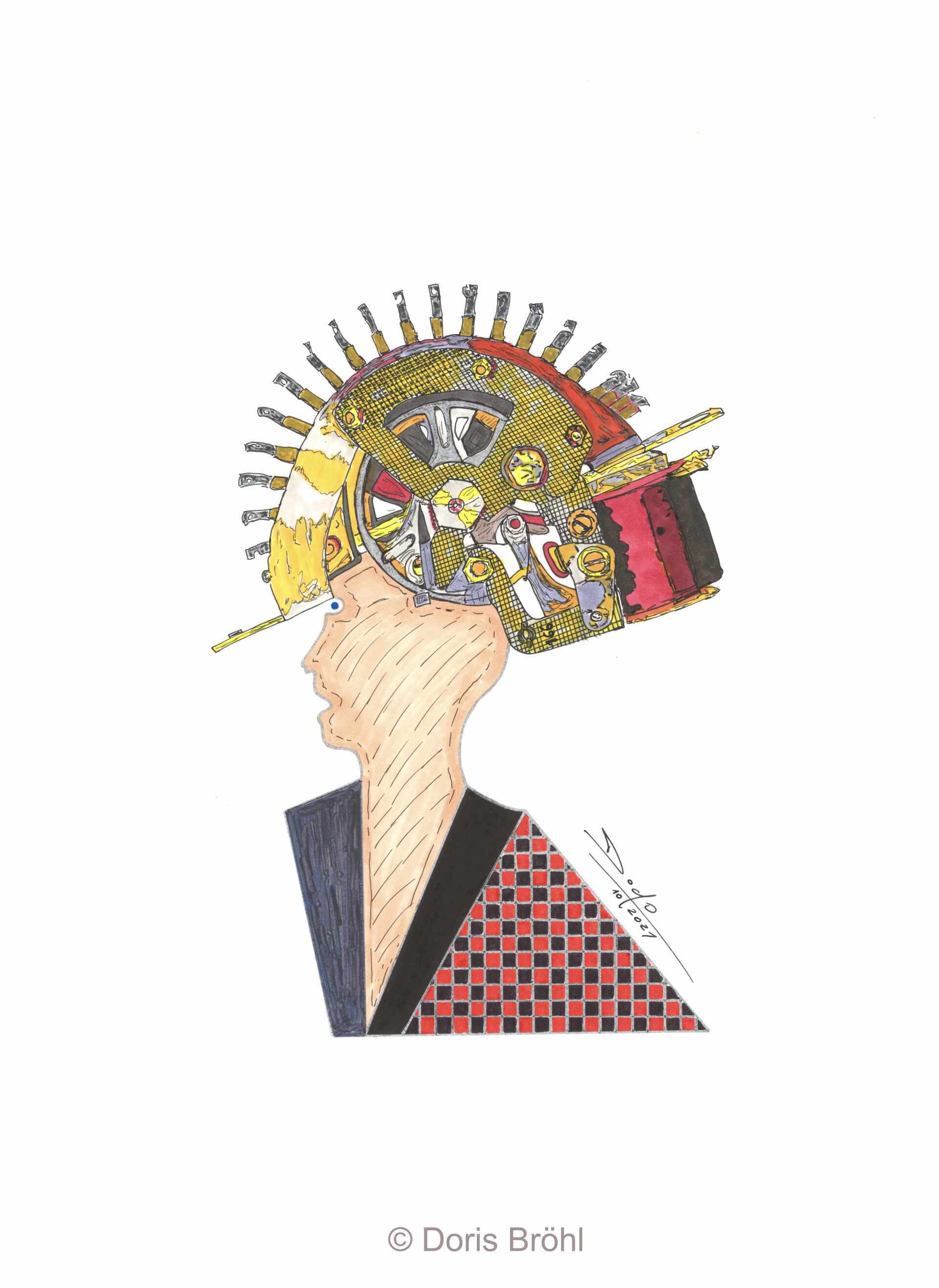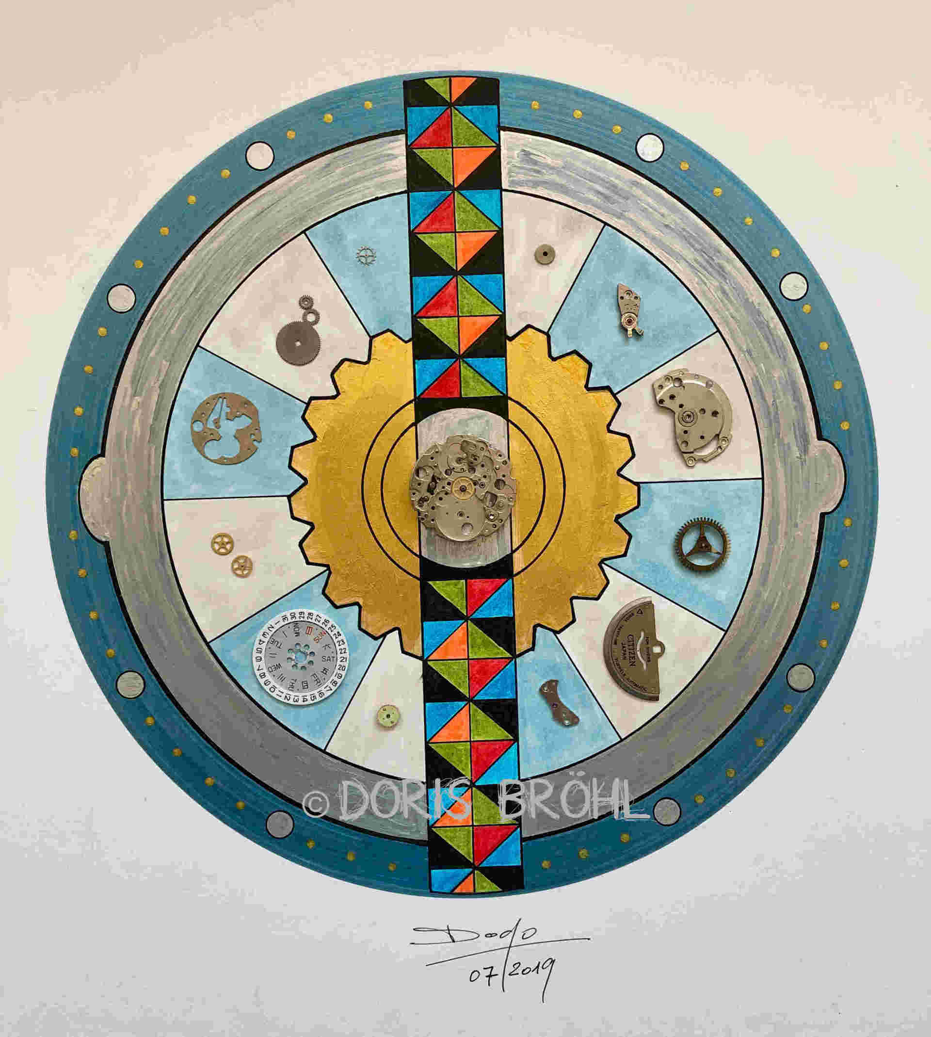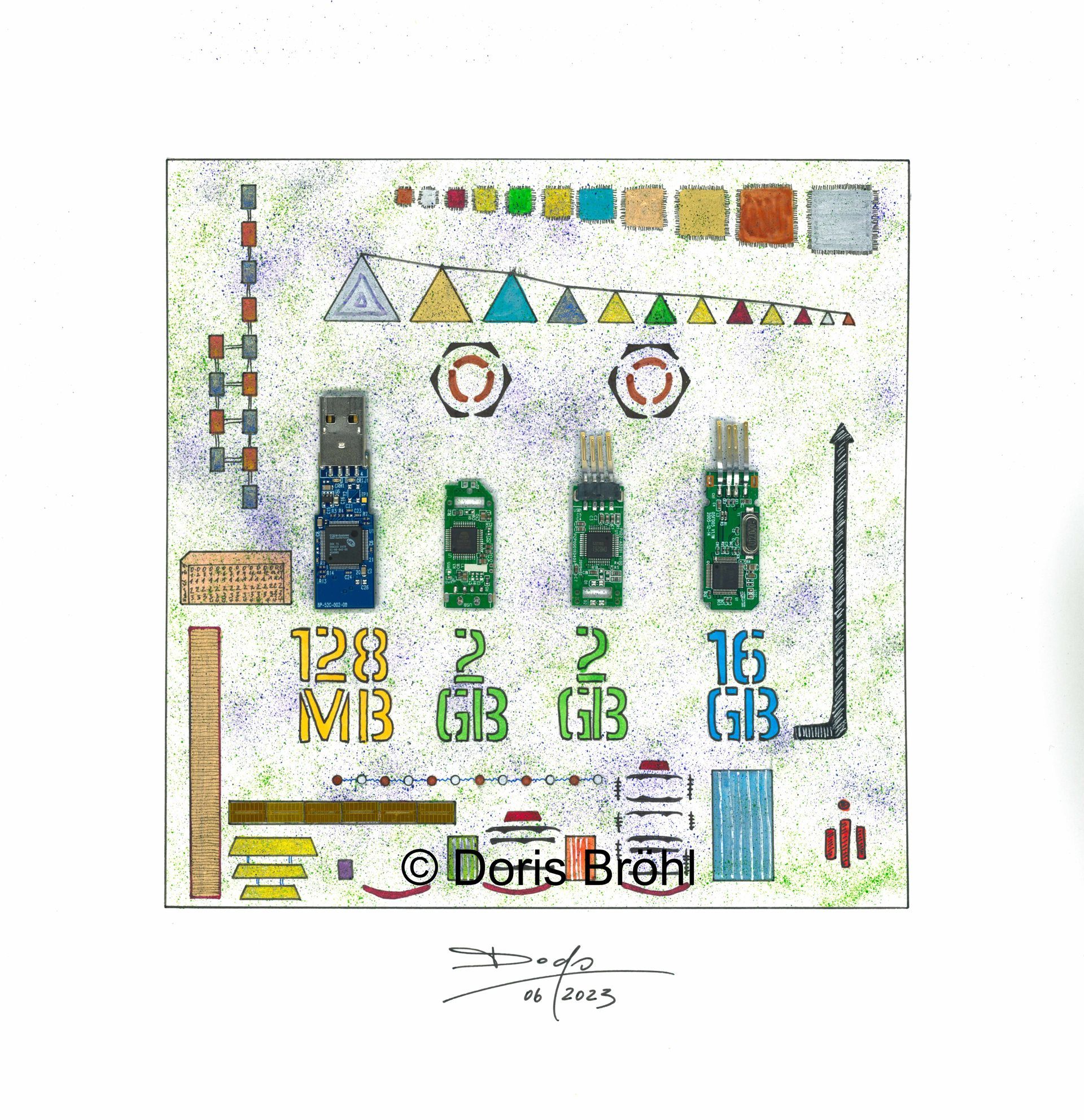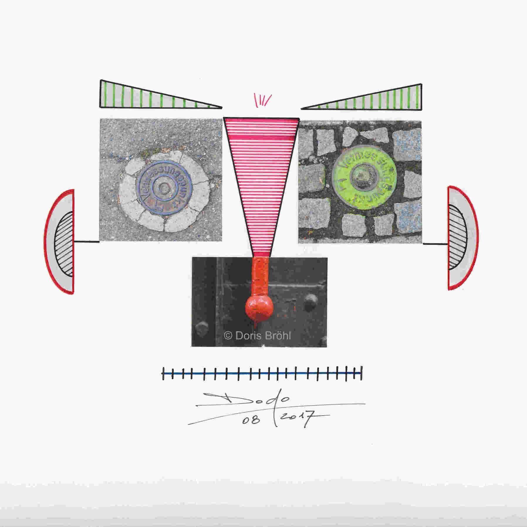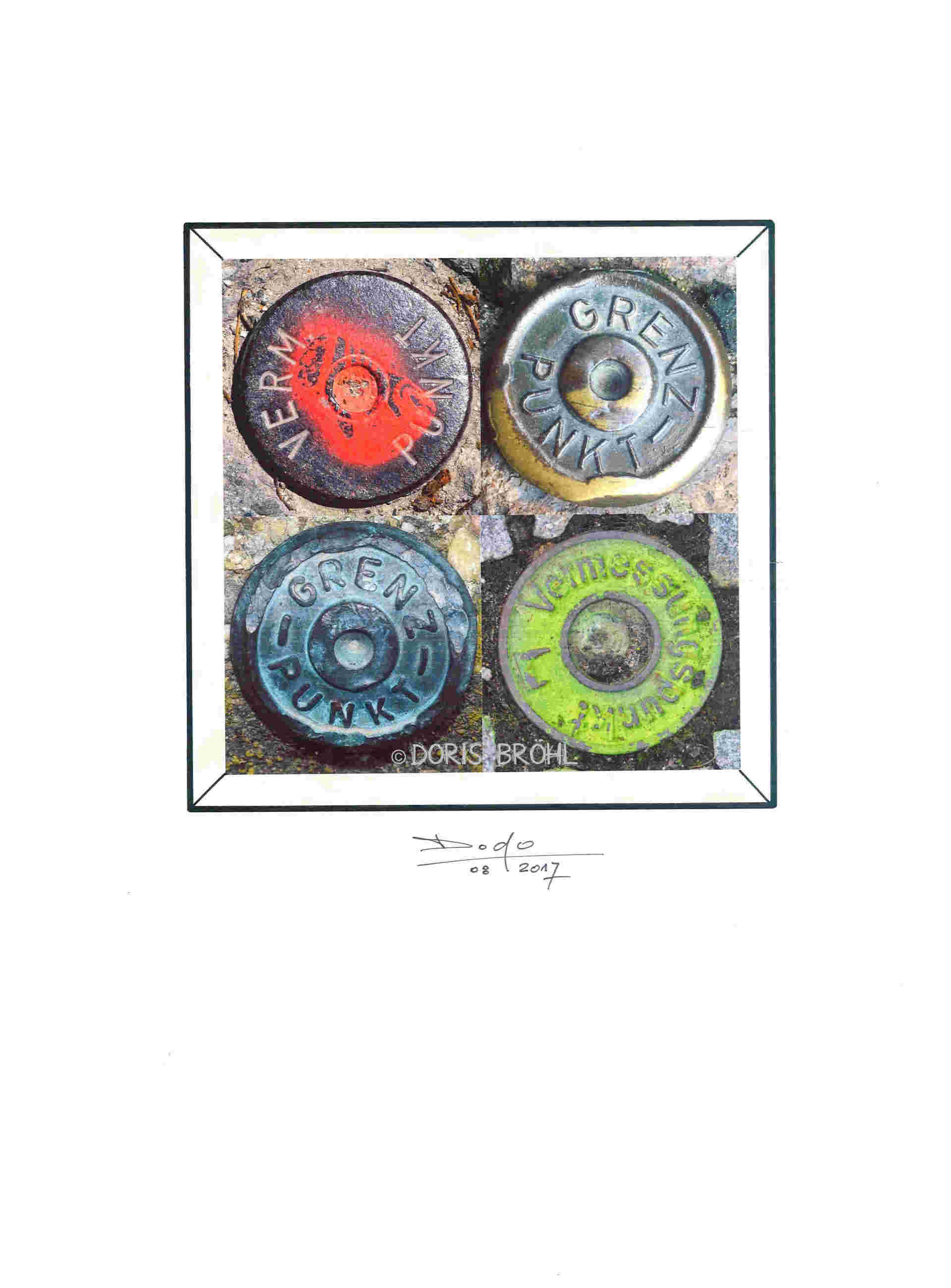 Eine Kamera habe ich immer dabei. Daraus entstehen viele Momentaufnahmen. Bei den nachfolgenden Bildern sieht man die Kombination aus größtenteils eigenen Fotografien und den von mir selber gezeichneten und colorierten "Ergänzungen" zur Fotoaufnahme aber auch viele gezeichnete und montierte Bilder. In manchen Bildern verwende ich Originalteile direkt im Bild. Das können z.B. Unterlegscheiben, Kordel und Fäden, Glasröhrchen, Rührstäbchen, Teile aus alten Uhren, Alu-Profile, Knöpfe etc. etc. sein oder auch nur Objekte.