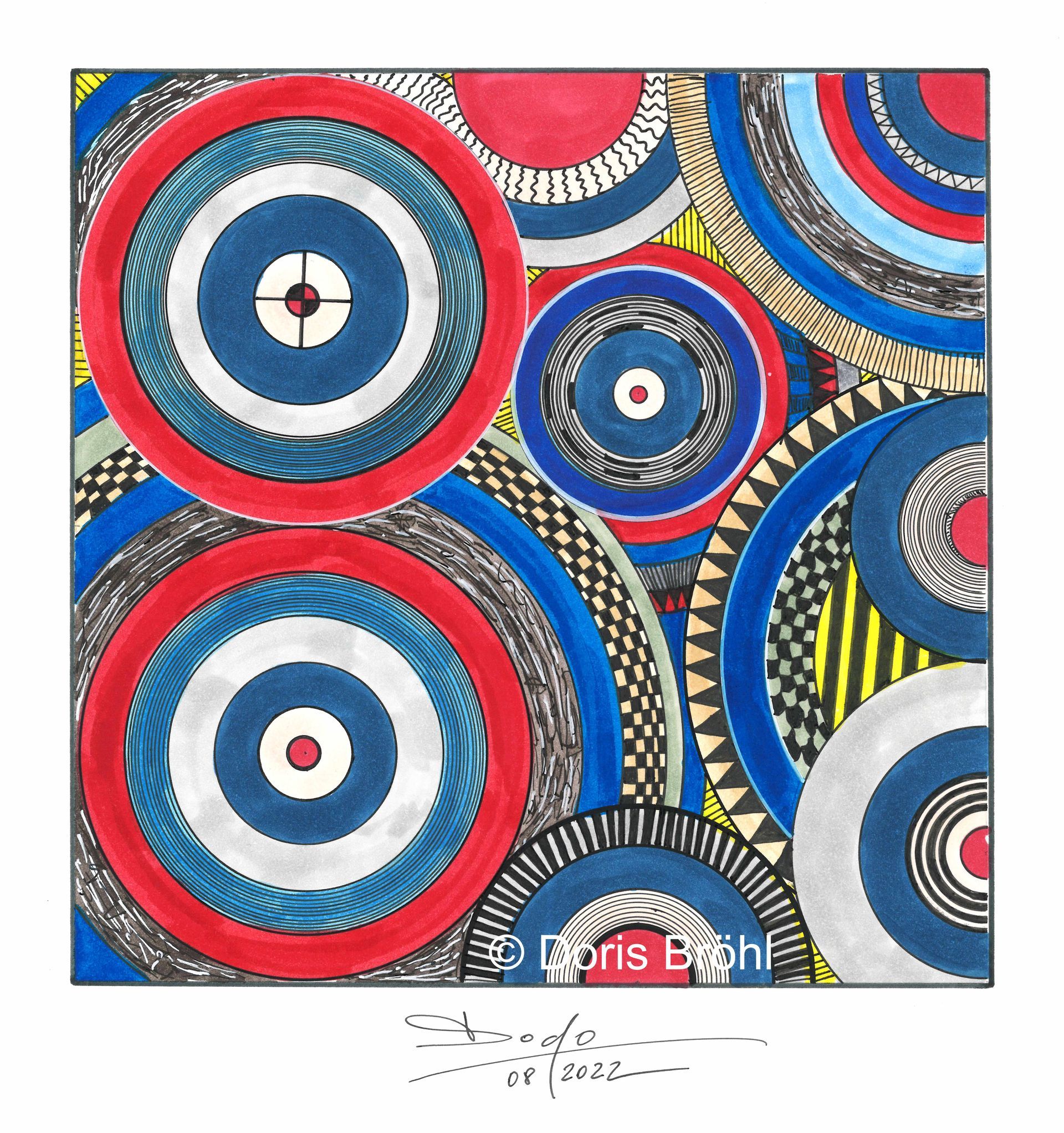 Hier habe ich alte Single-Schallplatten bemalt und sie auf einen weißen Zeichenkarton 30x40 cm geklebt